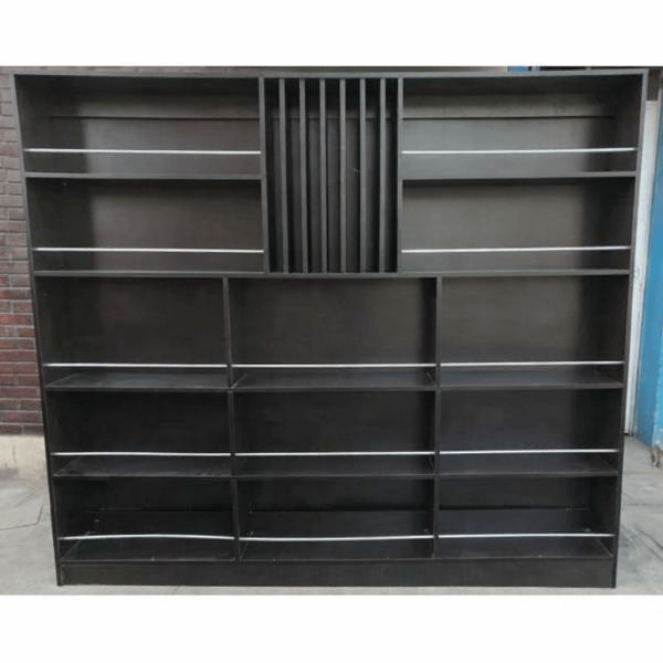 Mueble de melamine color oscuro, ideal para exhibición y organización en espacios comerciales. Diseño elegante, resistente y funcional para todo tipo de negocios.